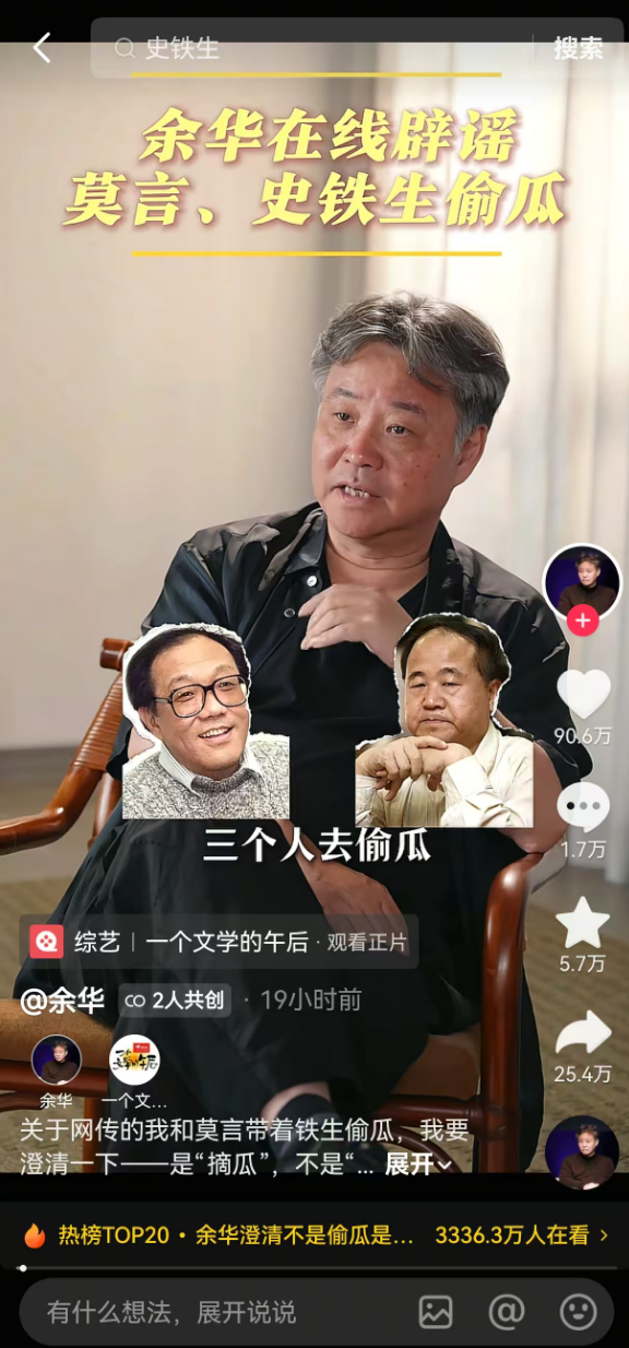 4月14日,余华在个人社交账号发视频辟谣“偷瓜”事件:当时只是去摘瓜没偷,也没带铁生。